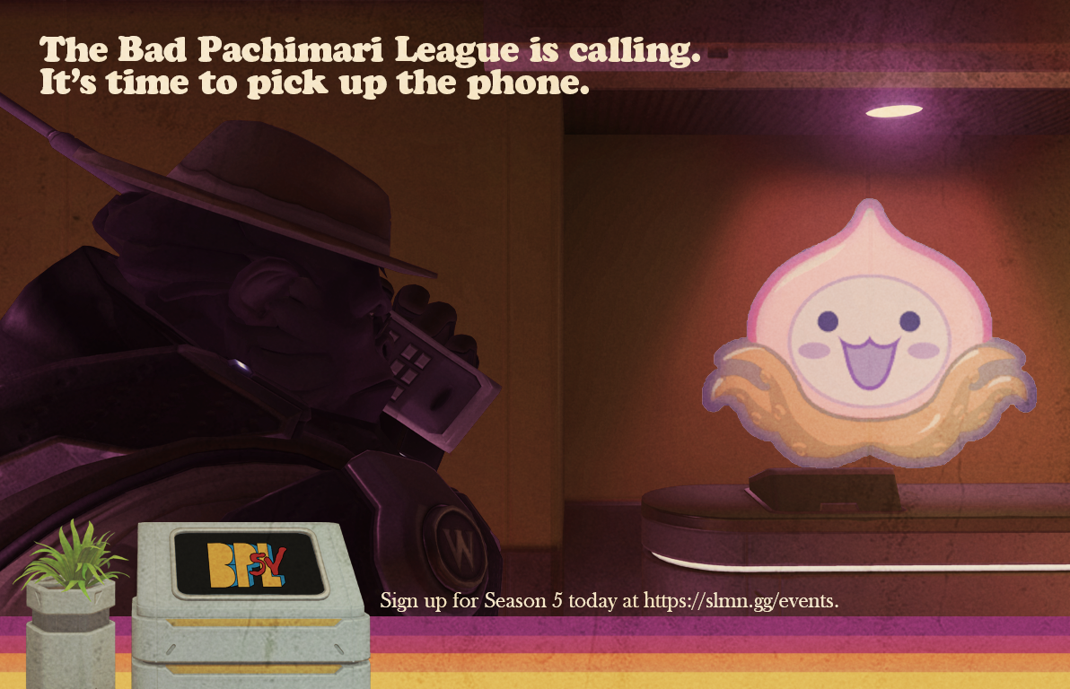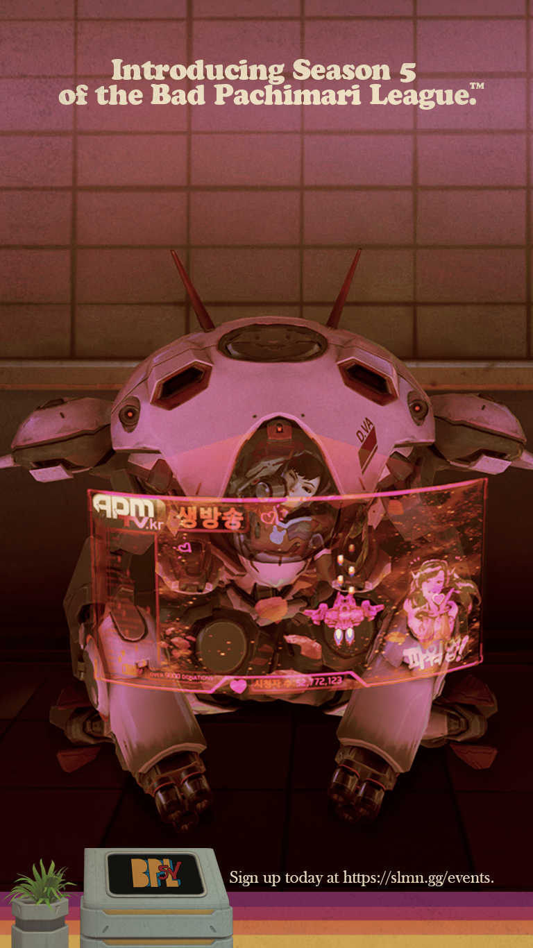 D.va, the character in the first two graphics, has an emote where she plays an old arcade style game using a projection from her mech. Winston, the character in the second two graphics has an emote where he pulls out a chunky old phone - perfectly on theme. The strange tentacled turnip in the fourth image is the 'pachimari' - a toy of some kind in the Overwatch universe, and what BPL (Bad Pachimari League) is named after.