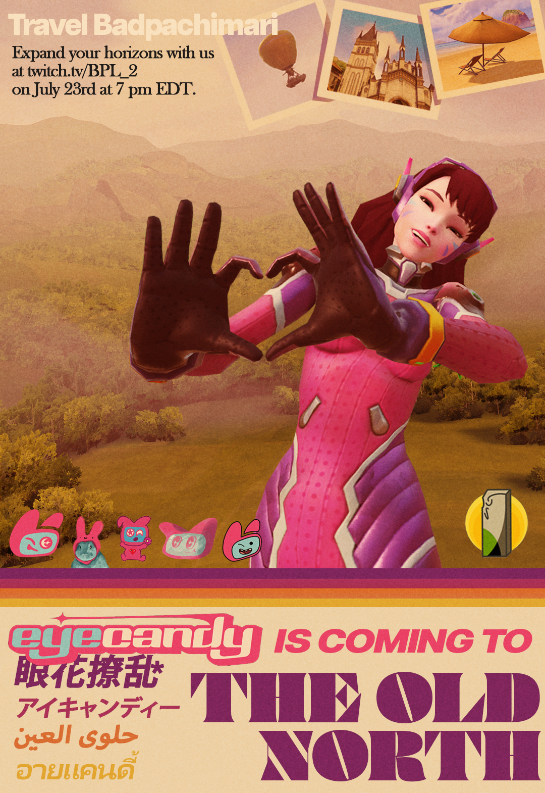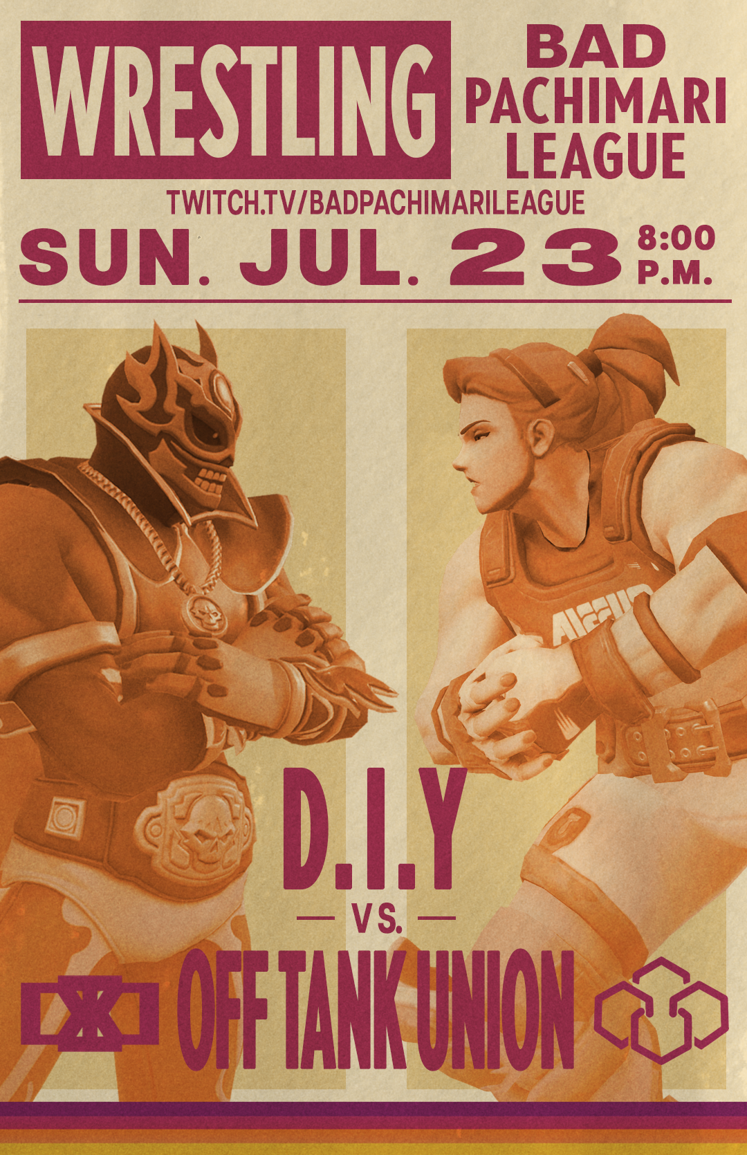 As proof-of-concept, I generated a few announcement graphics, using screenshots of characters from within the game, combined with existing in-game environments. Often times, Overwatch esports related graphics tend to use somewhat random cut-out images of characters placed upon unrelated patterns and backgrounds, so I wanted to focus on using specific character skins and emotes that help to tie into the theme. I artificially weathered these graphics, adding a yellow wash to mute the whites, and film grain effects to dirty them up further. These techniques were then used throughout every graphic I made for the rest of the season.